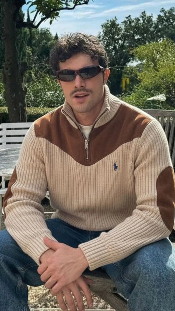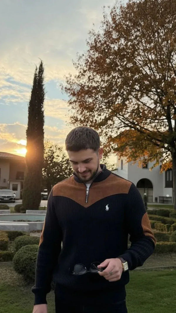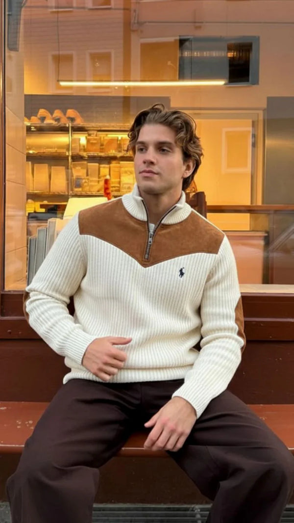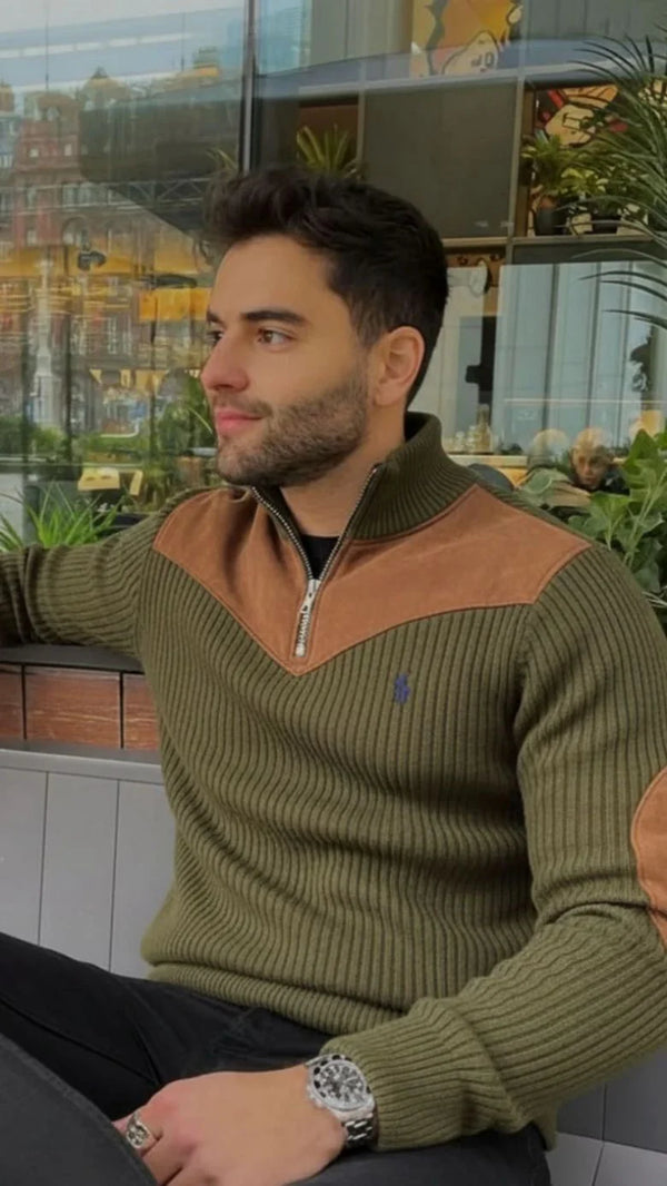 Modern Ribbed Knit Zip Sweater with Suede Accents